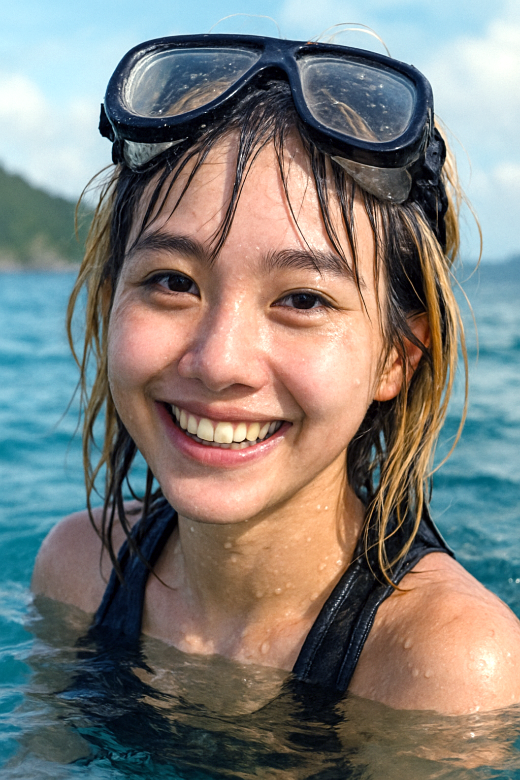 Elle trottine jusqu'à la mer, marche un peu, l'eau lui arrive jusqu'aux cuisses, puis pose ses fesses.